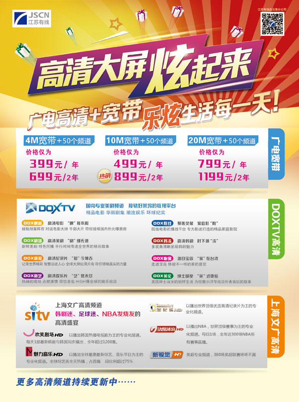 無以倫比的動感畫面、多聲道環繞立體聲的逼真效果,大畫面、大場景、大制作的中外影片帶您步入高清新“視界”。高清頻道 目前可免費收看的高清頻道有CCTV-1高清、CCTV-5+高清、北京衛視高清、東方衛視高清、江蘇衛視高清、湖南衛視高清、黑龍江衛視高清、深圳衛視高清、廣東衛視高清和浙江衛視高清等10家公共頻道,此外近期又新增CCTV-3高清、CCTV-5高清、CCTV-6高清、CCTV-8高清等4套高清節目。另外客戶也可根據意愿開通付費節目DOX四套高清頻道和新視覺五高清頻道。